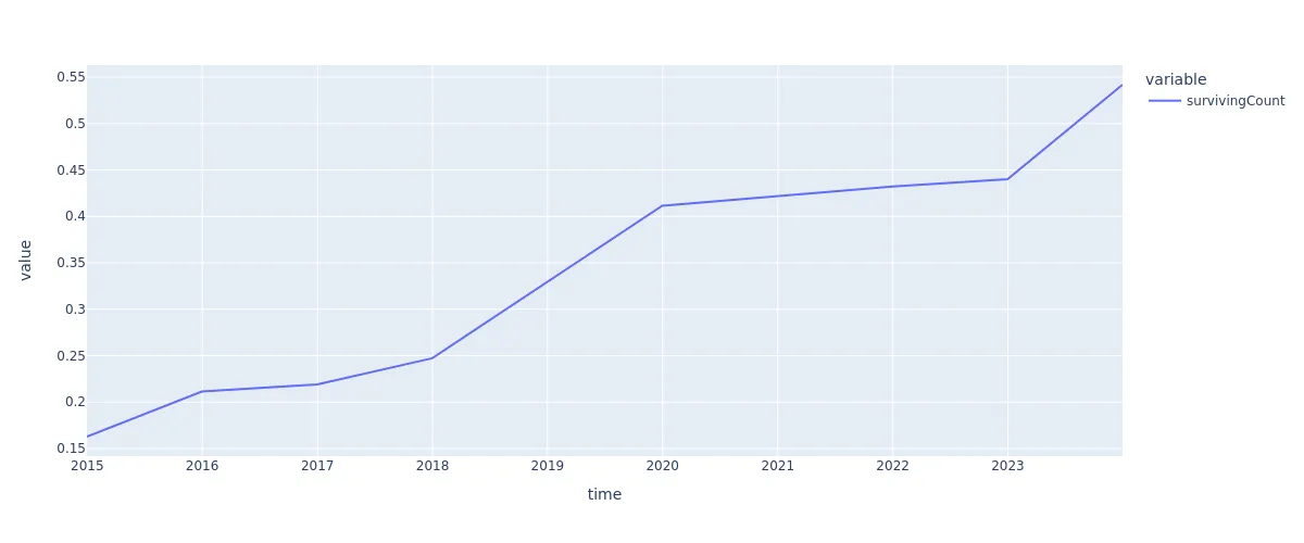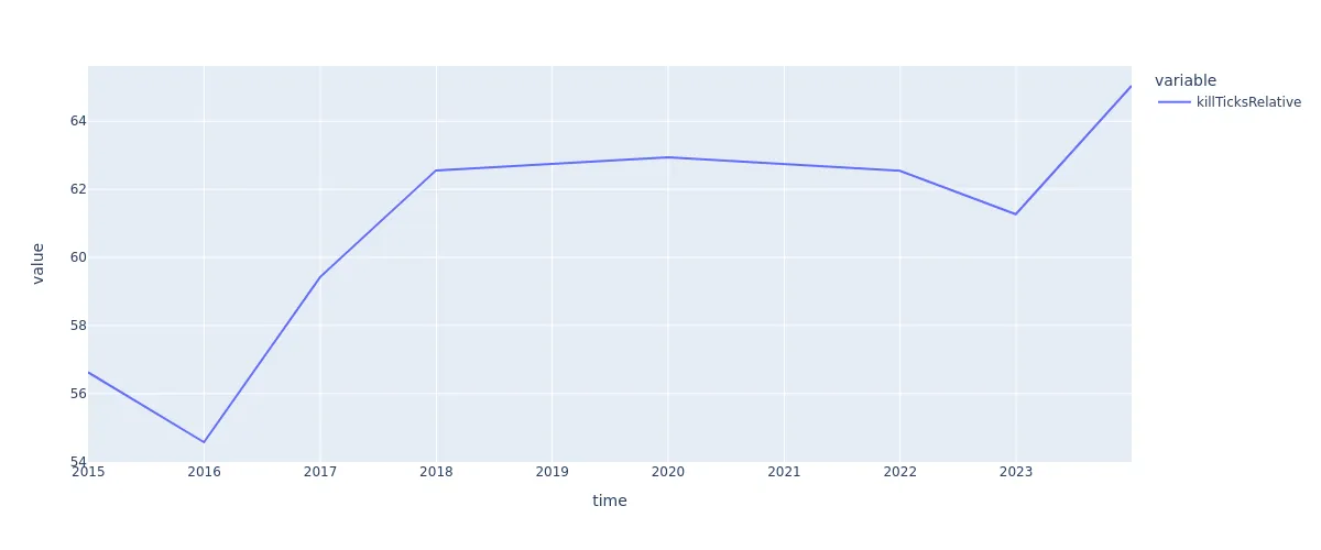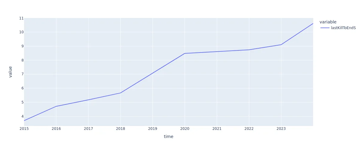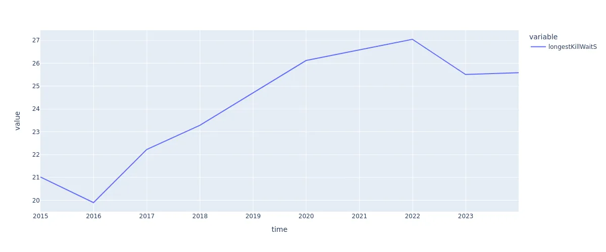 The longest wait between kills went from a low of 19 seconds in 2015, to peaking at 27 seconds in 2021. It currently averages at 25 seconds.
