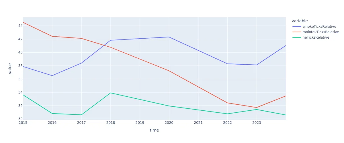 They’re thrown at virtually the same point in a round. Smokes too, are thrown at virtually the same, moving between 33 and 38 seconds in a round (this does not cleanly go up, unlike the other statistics).